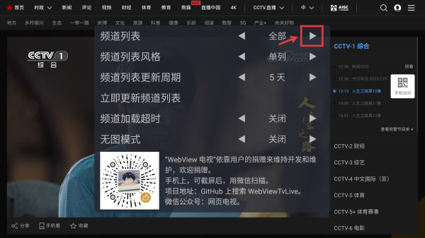 3、在设置界面,找到频道列表选项,点击其右侧的切换按钮,展开频道列表风格选择项。