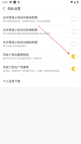 4、在隐私设置页面找到开启个性化广告推荐,点击开关。