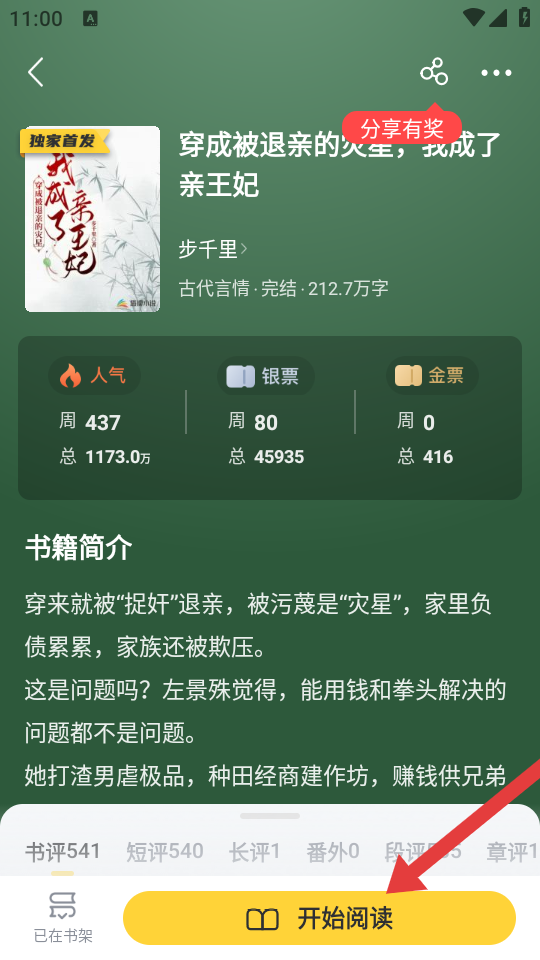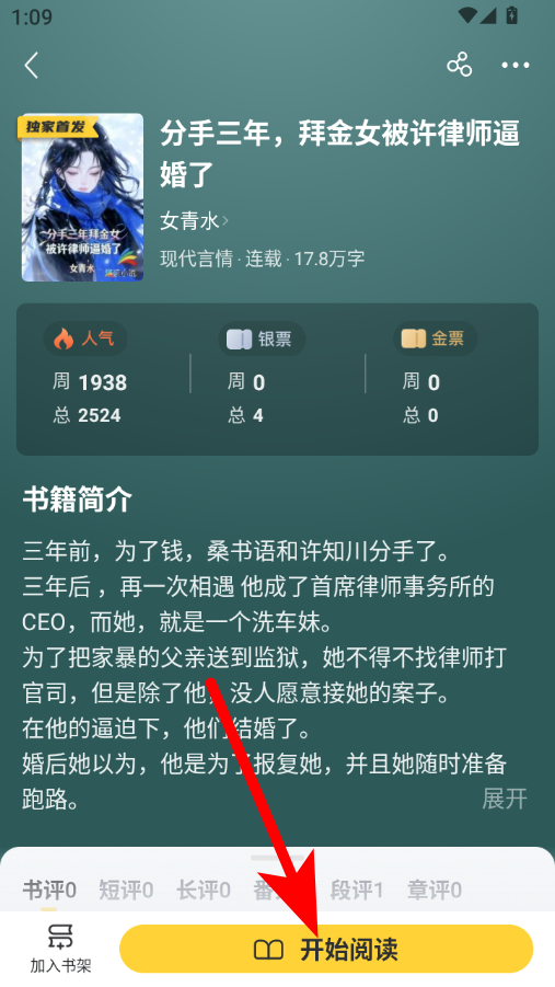 2、在小说的详情页,点击黄色的开始阅读按钮,进入小说阅读界面。