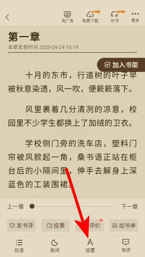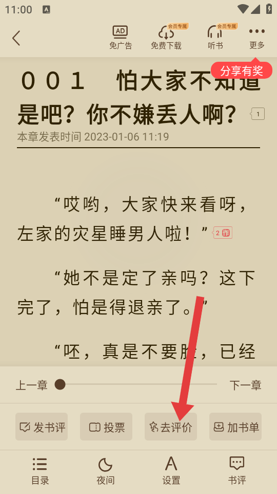 3、在小说阅读界面,点击任意地方调出功能面板,再点击底部的去评价按钮。
