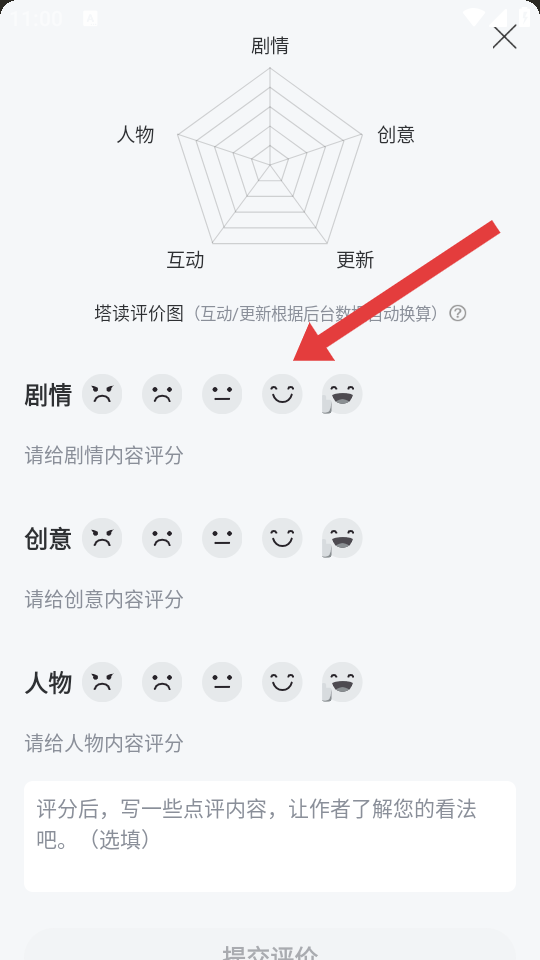 4、进入评价页面,对剧情等维度选择评分表情,还可填写文字点评,完成作品评价。