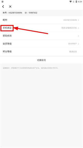 3、在账号详情页,点击手机绑定,进入手机绑定页面。