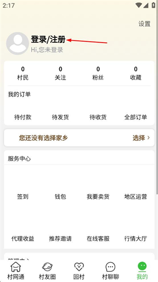 1、打开村网通APP,点击首页右下角我的。