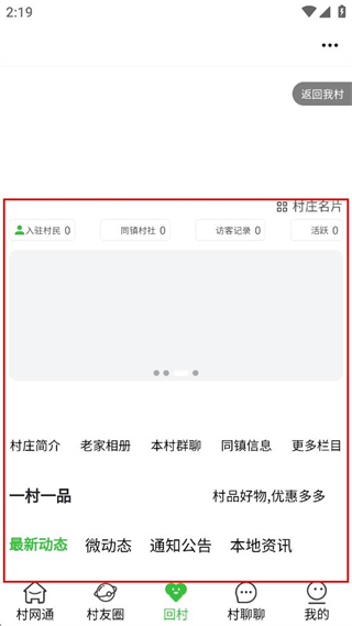 4、登录后点击回村,即可查看村庄的入驻村民、同镇村社等信息及村庄简介、老家相册等栏目。