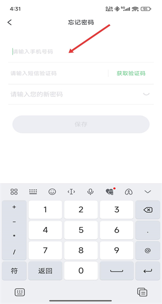 4、在忘记密码界面,输入手机号码后点击获取验证码,填写验证码后设置新密码,点击保存按钮,完成密码重置操作。