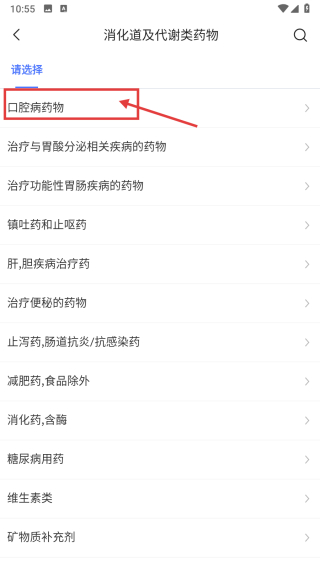 3、在消化道及代谢类药物列表页,点击口腔病药物选项,进入口腔病药物分类页。