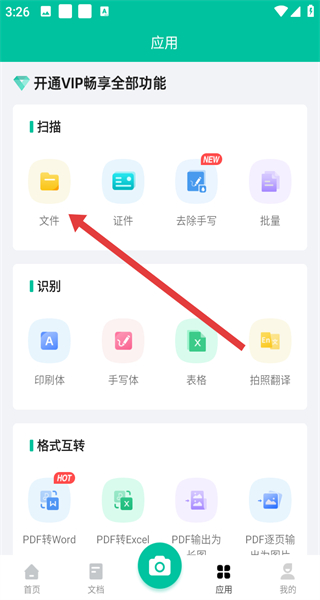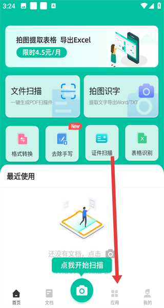1、在扫描仪全能王APP首页,点击下方的应用选项,进入应用功能界面。