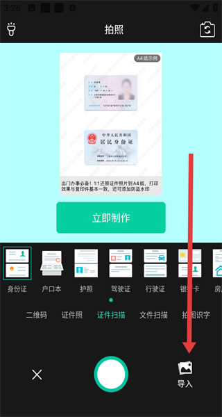 3、在拍照界面,点击右下角的导入按钮,进入相机胶卷界面。