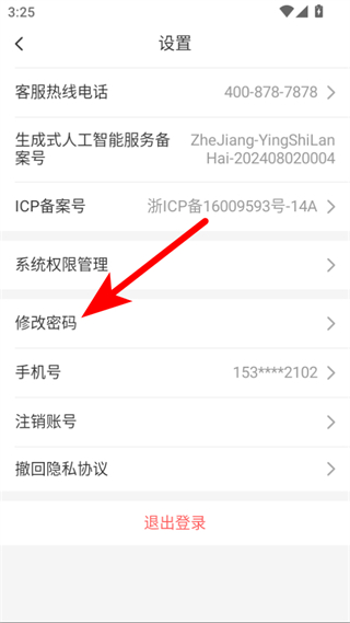 3、在设置界面里,点击修改密码选项,进入修改密码页面。