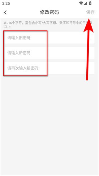 4、在修改密码页面,依次输入旧密码、新密码并再次输入新密码,点击右上角的保存按钮,即可完成密码修改。