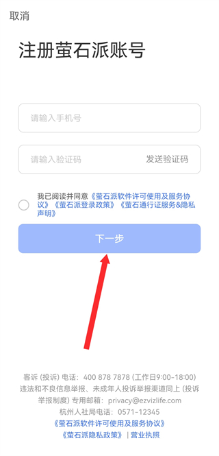 3、进入注册萤石派账号页面,输入手机号、验证码后,点击下一步。