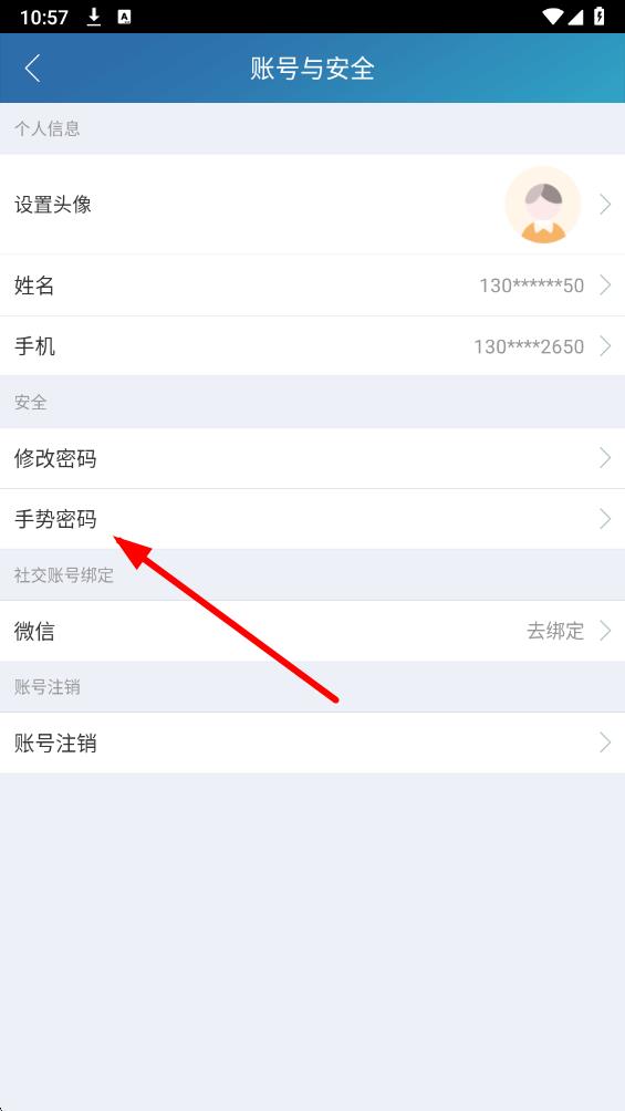 3、在账号与安全页面中,找到并点击手势密码选项。