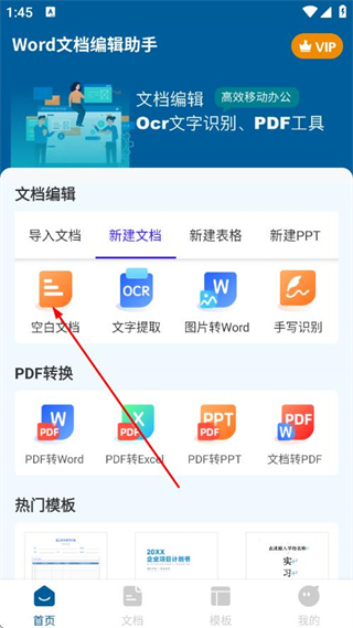 1、打开Word文档编辑助手APP,在首页点击空白文档,进入文档编辑页面。
