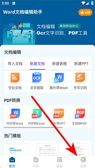 1、打开Word手机文档APP,点击右下角我的,进入个人页面。