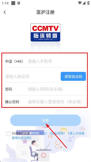 4、在医护注册页面填写手机号、获取并填写验证码,设置密码后,勾选协议并点击注册,完成账号注册操作。