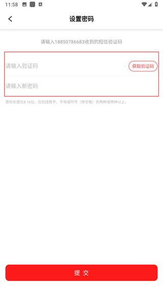 4、点击获取验证码的按钮,将其输入然后输入新密码。