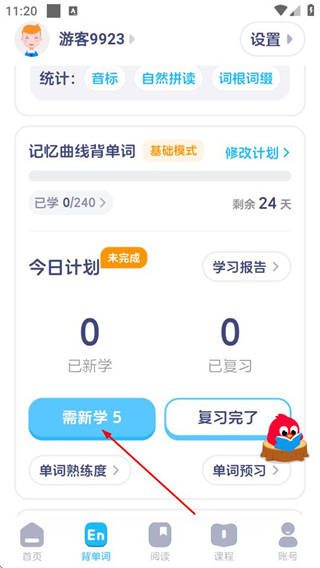 2、在背单词页面点击需新学按钮,进入单词的学练页面。