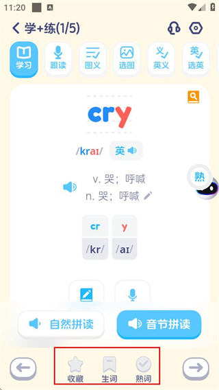 3、在学练页面,可通过底部的收藏、生词、熟词按钮,对当前单词进行对应的标记操作完成背单词操作。