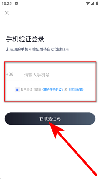 3、输入手机号,勾选已阅读并同意后,点击获取验证码。