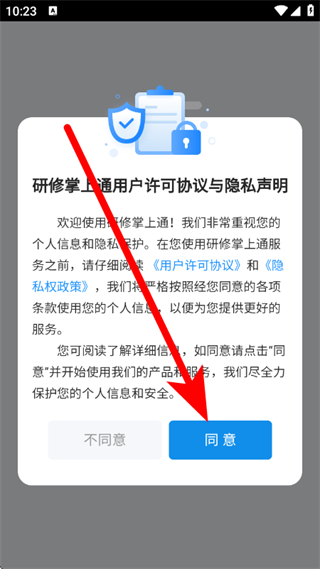 1、打开研修掌上通,在用户协议弹窗中,点击同意。
