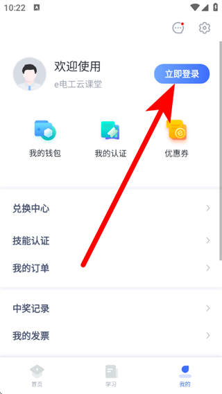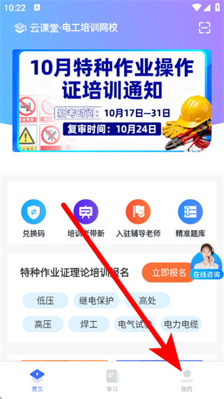 1、打开e电工云课堂,点击底部我的,进入我的页面。