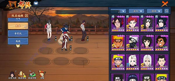 这套阵容很强势,忍者获取不难,佐助每个都有,红完成木叶祭就有送,我爱罗的话如果能抽到最好,抽不到就等通关第三关英雄副本送,还是很简单的。缺点就是1号位火主和2号位的佐助先攻要比对面高,不然对面开始就被打断很难受的。如果被打断还被对面多个控,那就GG,游戏结束。