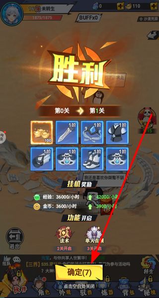 4、胜利后领取奖励,获取金币、装备等资源,点击确定继续游戏,开启新的关卡和挑战,丰富游戏体验。