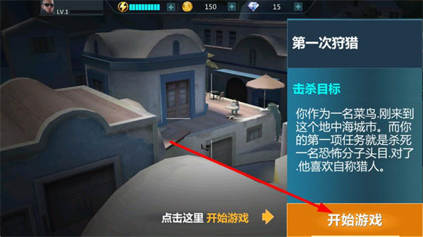 1、点击开始游戏按钮进入任务,根据任务提示了解目标信息,选择合适的狙击位置,确保任务顺利进行。
