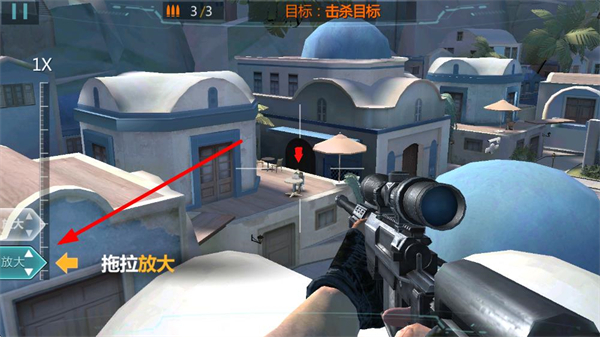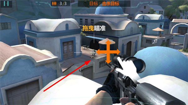 2、拖曳屏幕调整狙击枪瞄准方向,寻找目标所在位置,瞄准过程中需保持耐心,仔细观察场景细节。