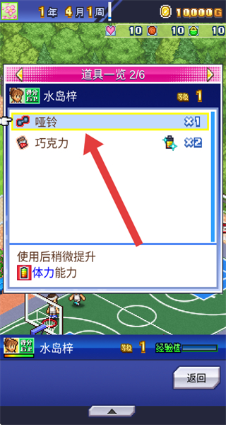 4、在道具一览界面,选择哑铃道具,使用后可稍微提升球员体力能力。