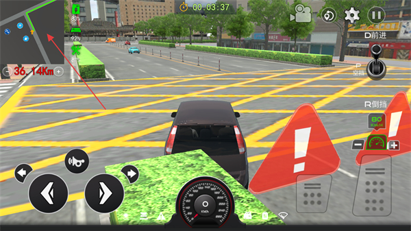 2、进入驾驶界面后,通过右侧操作区域控制车辆前进D挡、后退R挡,左侧按钮控制方向。