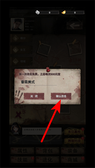 4、输入完成后,点击确认改名按钮,即可完成名字的修改第一次改名免费,之后每次改名需要500元宝。