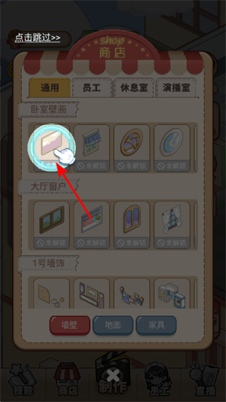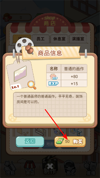 3、进入商店界面后,点击如普通的画作之类的装饰道具,可查看其属性和功能,是提升店铺装饰等级关键操作。