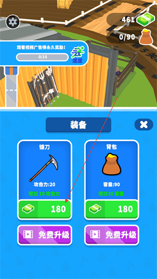 4、利用获得的绿钞,在装备界面升级镰刀和背包,增强收割效率和资源存储能力,持续循环收割、出售、升级的流程。