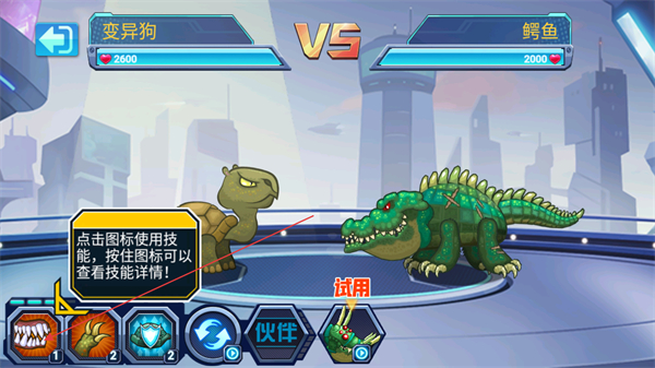 1、点击技能图标使用技能,按住可查看技能详情,对战鳄鱼时选择合适技能发起攻击。