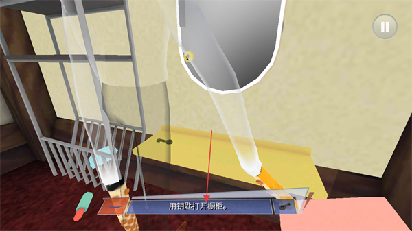 4、将钥匙插入橱柜锁孔,打开橱柜,推进游戏进程。