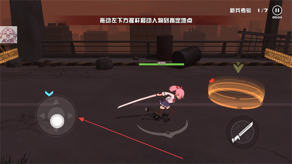 1、拖动左下方摇杆移动人物到指定地点,熟悉移动操作。