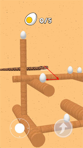 1、操控贪蛇移动,沿红色箭头方向靠近鸡蛋,收集鸡蛋使上方计数从0/5开始增加。