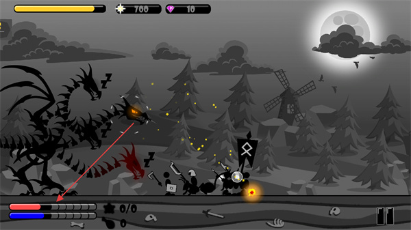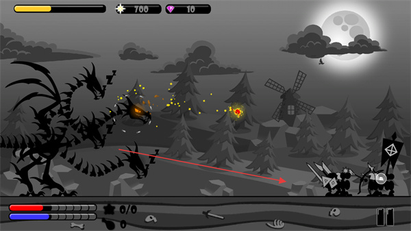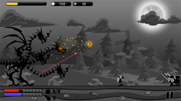 采用暗黑系美术风格构建横版战场,阴沉色调搭配破碎的城堡、荒凉的山脉等场景元素,营造出神秘且充满压迫感的氛围,贴合恶龙守护宝藏的主题。