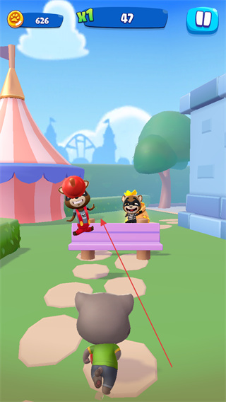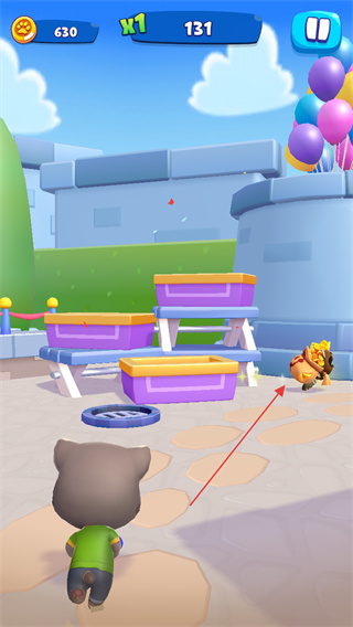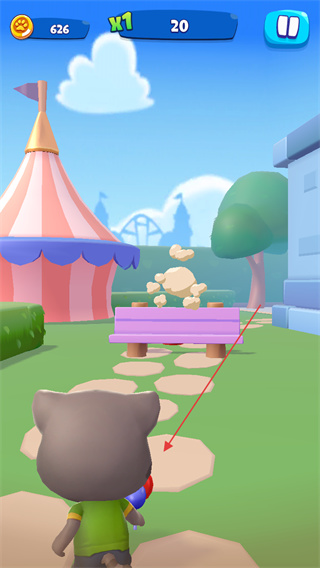1、操控汤姆猫在公园场景移动,瞄准目标发射道具,击碎障碍物。