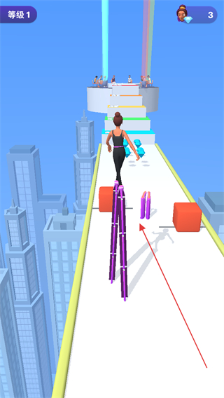 1、操控角色在跑道上奔跑,收集紫色鞋跟,增加高跟鞋高度。