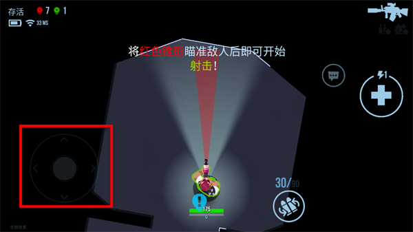 1、在子弹回声游戏界面,通过左侧虚拟摇杆控制角色移动,将红色锁狙瞄准敌人后即可开始射击。