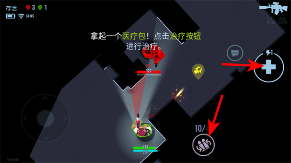 4、需注意血量,拿起医疗包后点击治疗按钮可进行治疗,合理利用资源完成游戏任务。