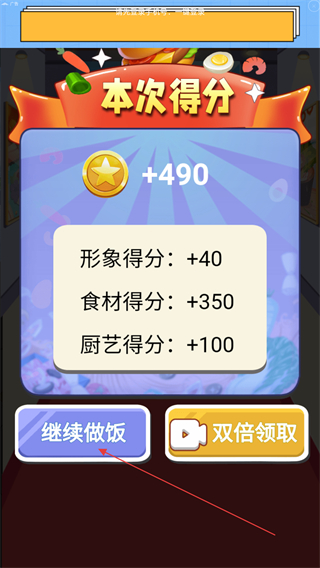 4、烹饪完成后,得分达标即可过关,之后可选择继续做饭挑战下一关或领取奖励。