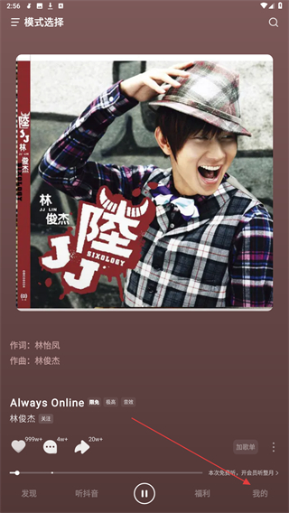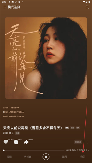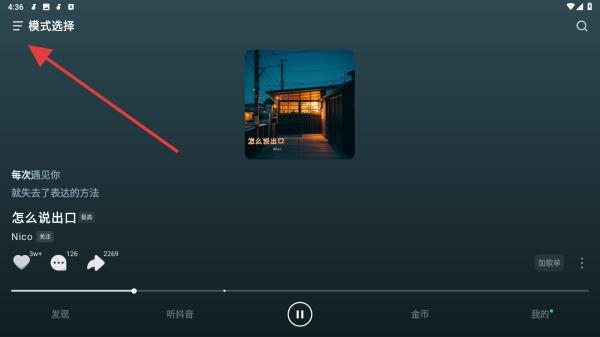 1、打开汽水音乐的歌曲播放界面,点击左上角的模式选择。