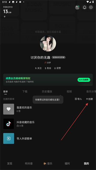 2、进入我的页面内,在歌单右侧点击+创建的功能按钮。