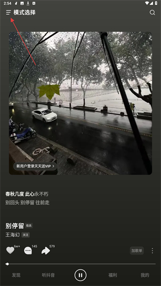 1、打开抖音音乐APP,在首页左上方点击三个横线的图标。