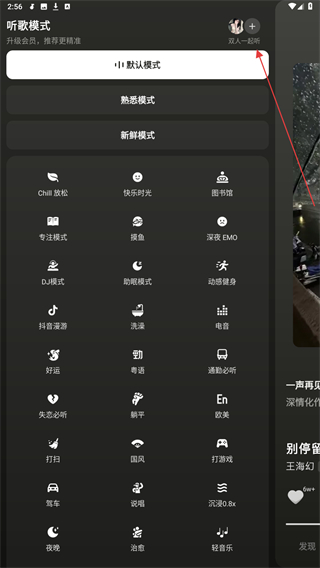 2、在左侧弹出的菜单栏中,点击上方双人一起听的按钮。