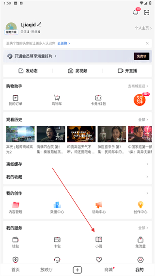 2、进入个人中心的页面内,在我的服务下点击小说。