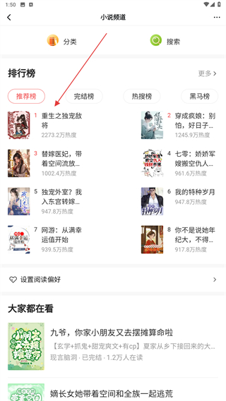 3、进入小说频道的页面内,选择并点击要观看的小说名称即可。